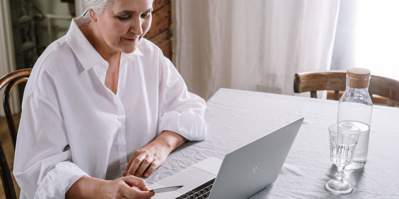 Eine ältere Frau sitz an einem Tisch und schaut auf eine Karte vor ihrem COmputer